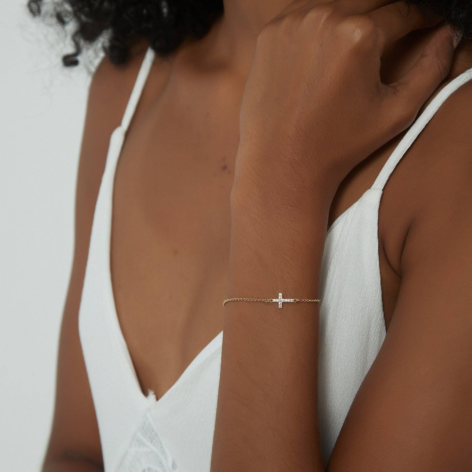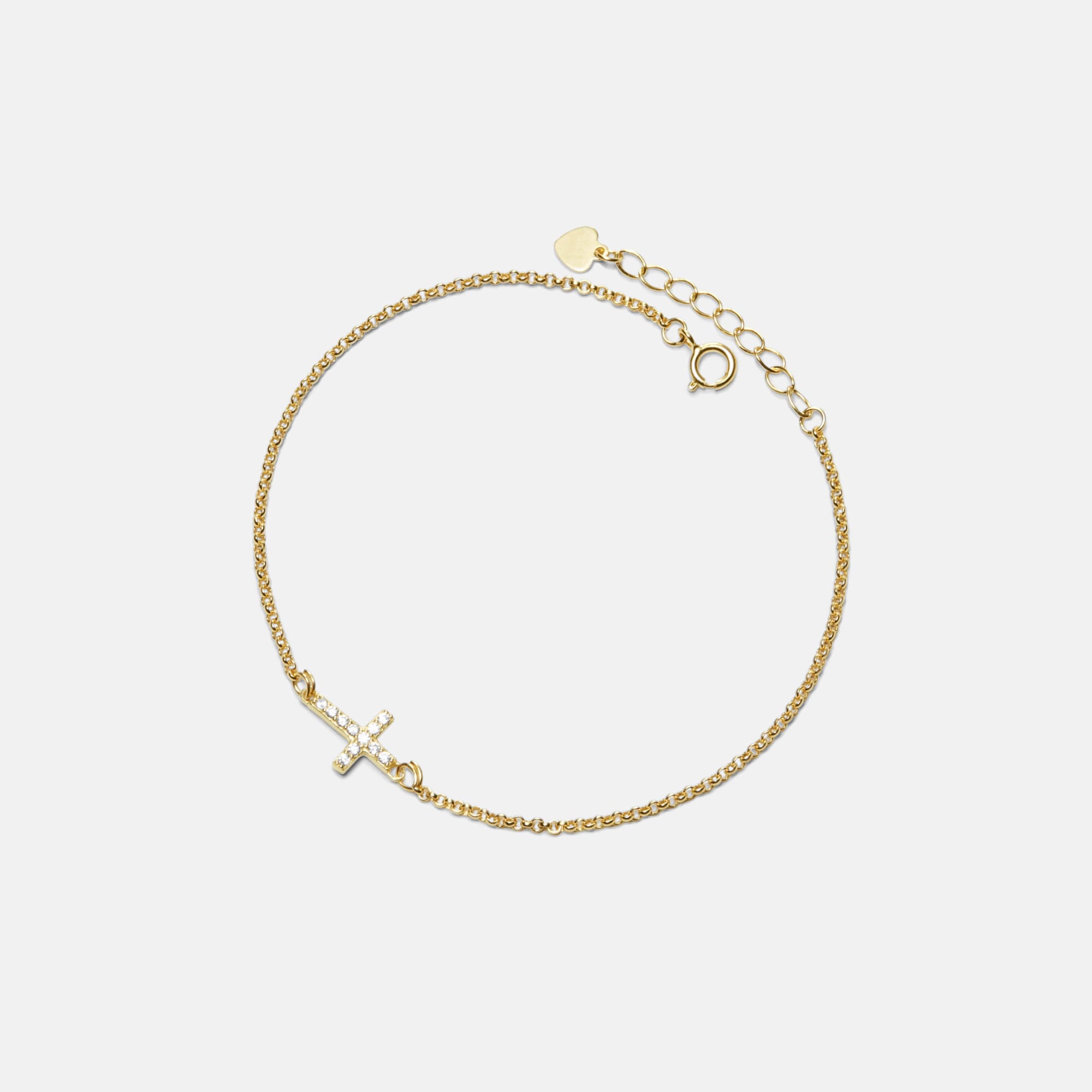 This dainty bracelet features a gold cross charm, symbolizing the Christian religion and the redeeming benefits of Jesus Christ. Made with 925 sterling silver and sparkling CZ stones, it is a pretty and delicate accessory. Perfect for both religious occasions and everyday wear.