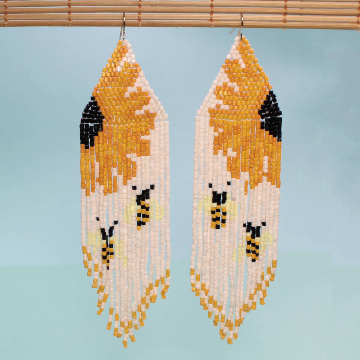 Radiate sunshine vibes with these spring bloom sunflower earrings. White woven seed bead earrings feature a buzzing bees and sunny flower. These flower fringe earrings are a boho-chic pop for your ears. Add a touch of nature's whimsy to your look.